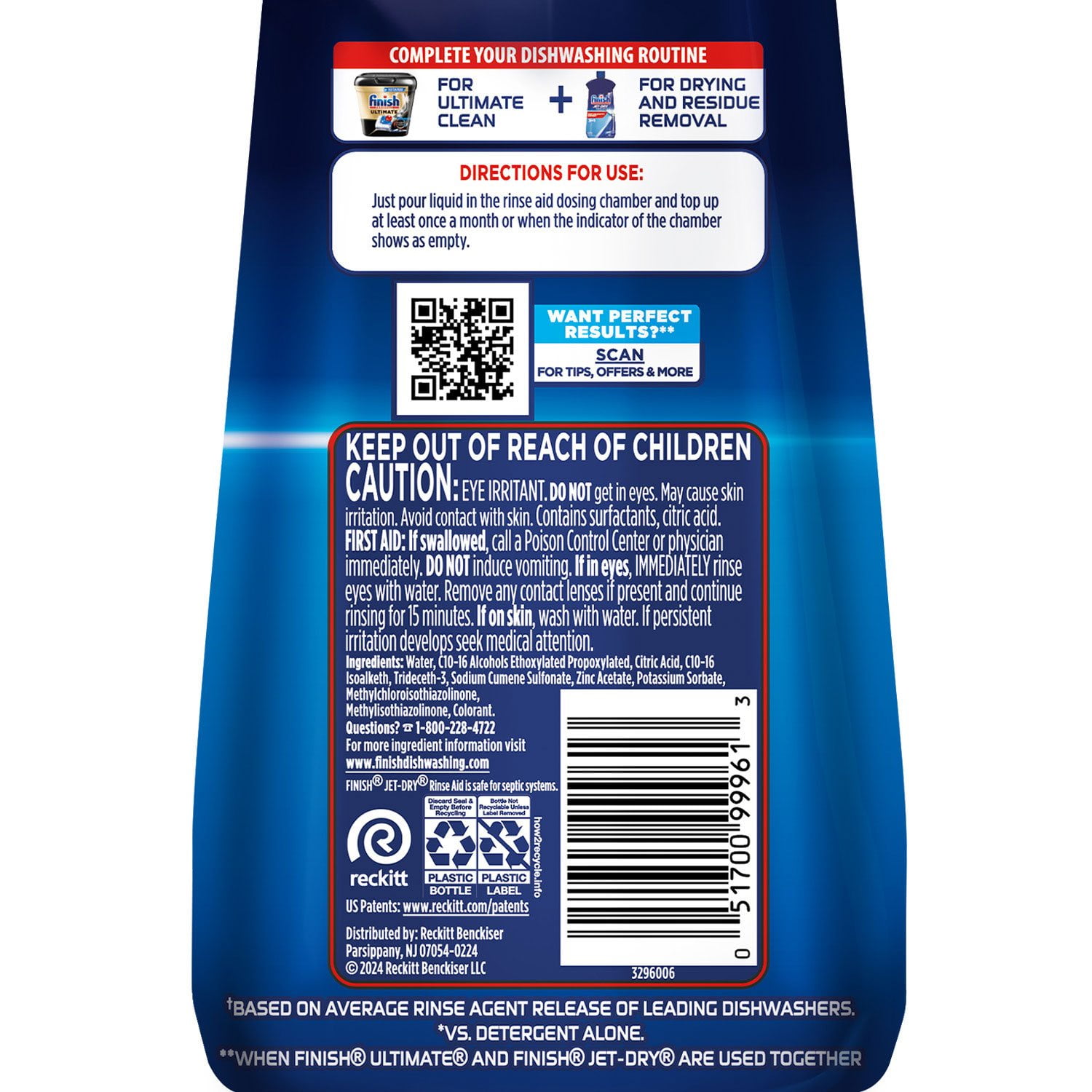 Finish Jet-Dry Ultra Rinse Aid Dishwasher Rinse & Drying Agent works with your dishwashing detergent to rinse away stubborn leftover food, dries left behind water droplets, and clears spots and film for brilliant sparkling dishes, glasses, and utensils. The Finish Jet-Dry Ultra Rinse Aid 3-in-1 solves three problems at once—it dries, prevents spots, and protects glasses, leaving you with perfect results every time!